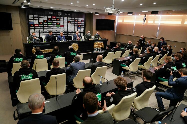 «Жалко, что врачи не разрешают с вами поздороваться и обняться, но думаю, что с завершением плей-офф такая возможность у нас будет. Хотел бы поблагодарить вас за хорошую игру. Вы — первые в Восточной конференции. Были близки к выигрышу всего регулярного чемпионата, но ладно. На этот раз мы уступили, чтобы дальше повезло. Но игра — есть игра, спорт — есть спорт. Я должен сказать, что мы гордимся нашей командой, гордимся своими хоккеистами. Вы прославляете российский хоккей, прославляете нашу республику», — заявил Президент команде.