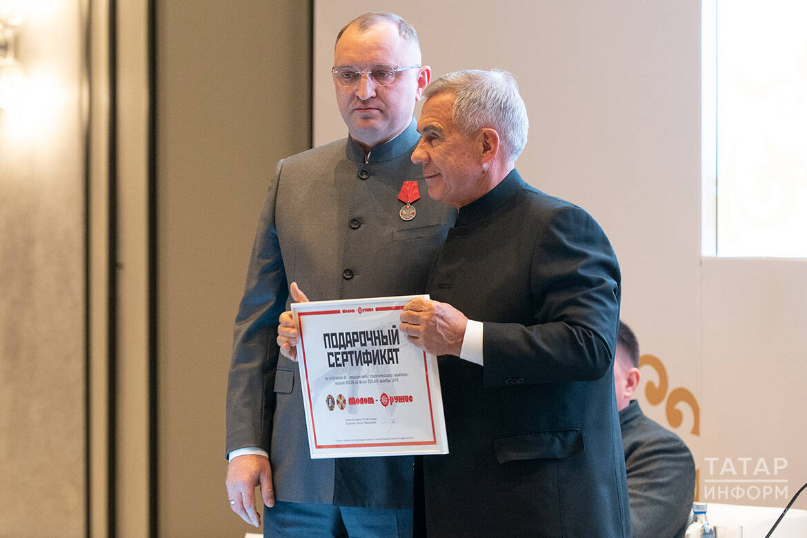 Равиль Нургалиев вручил Рустаму Минниханову подарочный сертификат на получение 25 гладкоствольных карабинов