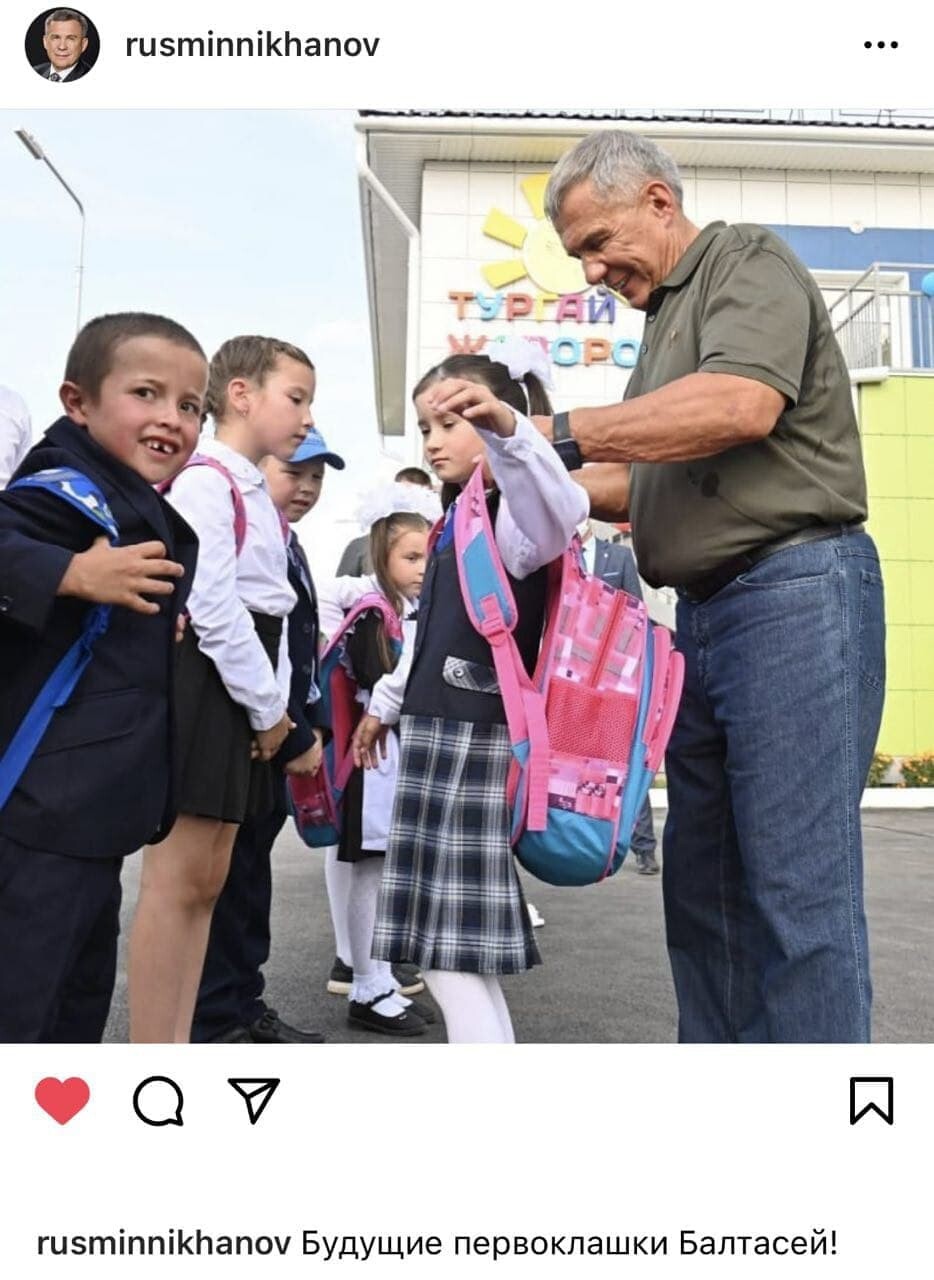 Президент Республики Татарстан Рустам Минниханов подарил рюкзаки первоклассникам в Балтасинском районе республики. Информация об этом появилась в Instagram-аккаунте президента.