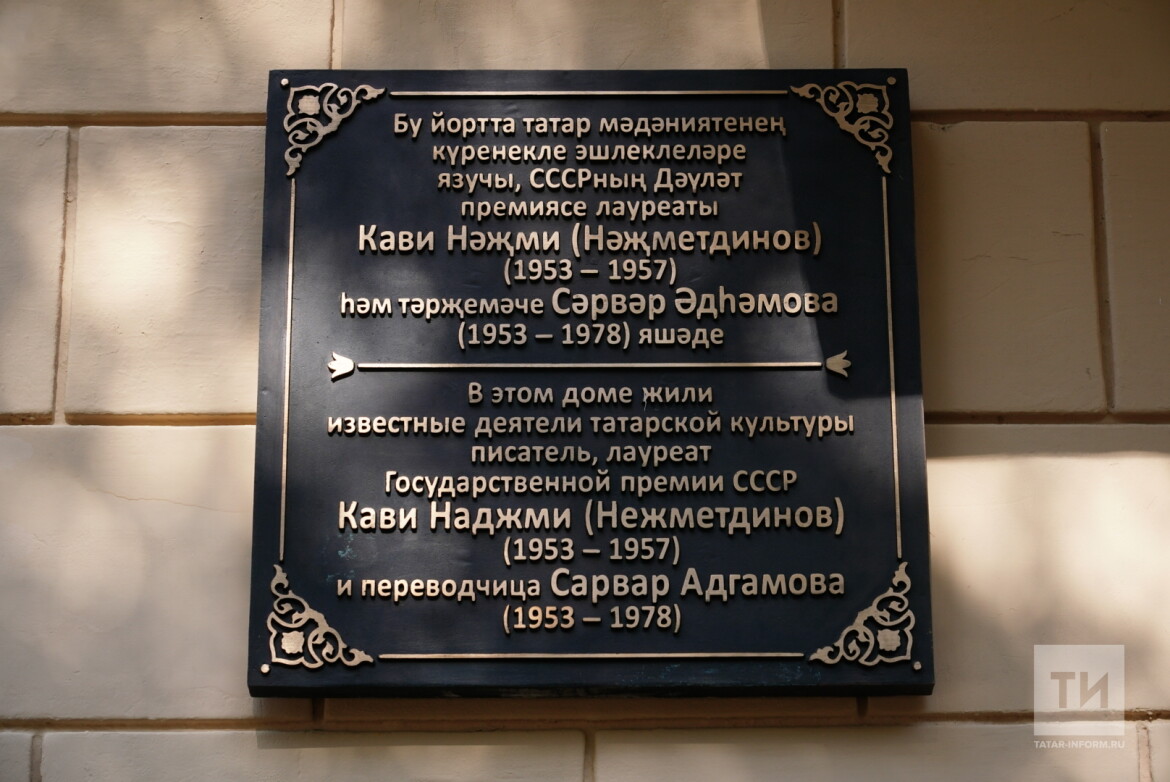 В Казани по улице Большая Красная, 57б состоялось открытие мемориальной доски в честь писателя, лауреата Госпремии СССР Кави Наджми и его супруги — переводчицы Сарвар Адгамовой.