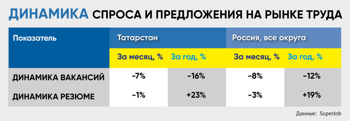 «Число активных резюме за месяц не изменилось. За год вакансий стало на 16% меньше, а резюме – на 23% больше. Рынок труда становится более сбалансированным. Подобные тенденции характерны для всего рынка труда России», – рассказали «Татар-информу» в пресс-службе SuperJob.ru.