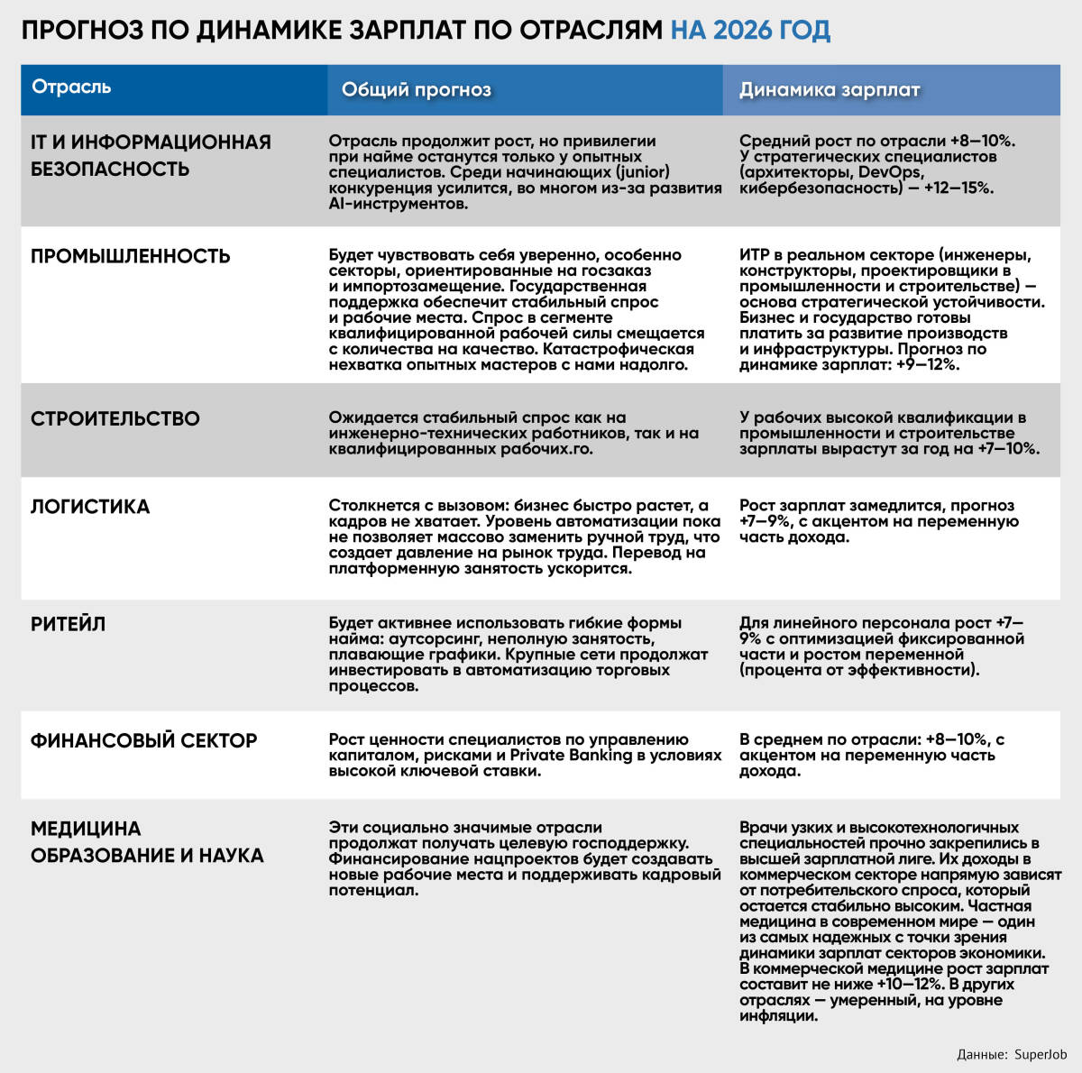 «В первую очередь под оптимизацию могут попасть работники, чьи функции связаны с простыми и повторяющимися операциями. Есть риски для позиций с размытыми функциями, а также для сотрудников с высокой зарплатой, не подкрепленной уникальной экспертизой. В частности, в IT-секторе наблюдается переизбыток начинающих специалистов при острой нехватке высококвалифицированных кадров (senior-разработчиков, архитекторов, DevOps-инженеров, специалистов по кибербезопасности)», – рассказали в SuperJob.ru.