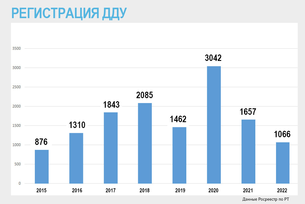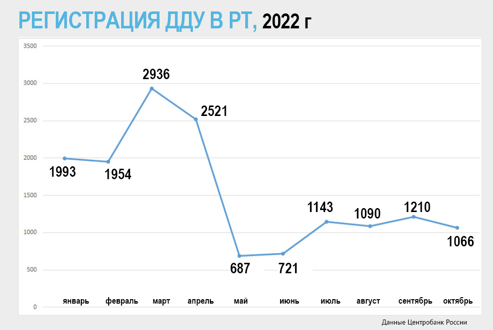 Посмотрите на график: на нем вы видите, сколько договоров долевого участия (ДДУ) Росреестр регистрировал в октябре в разные годы в Татарстане. Спрос на новостройки в прошлом октябре оказался самым низким за последние семь лет.