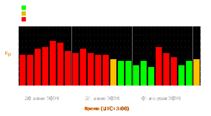 В целом вероятность магнитных бурь сотрудники лаборатории оценивают в 25% 30 июля и 30% — 31 июля и 1 августа. При этом вероятность сильного магнитного шторма останется неизменной — 35%.
