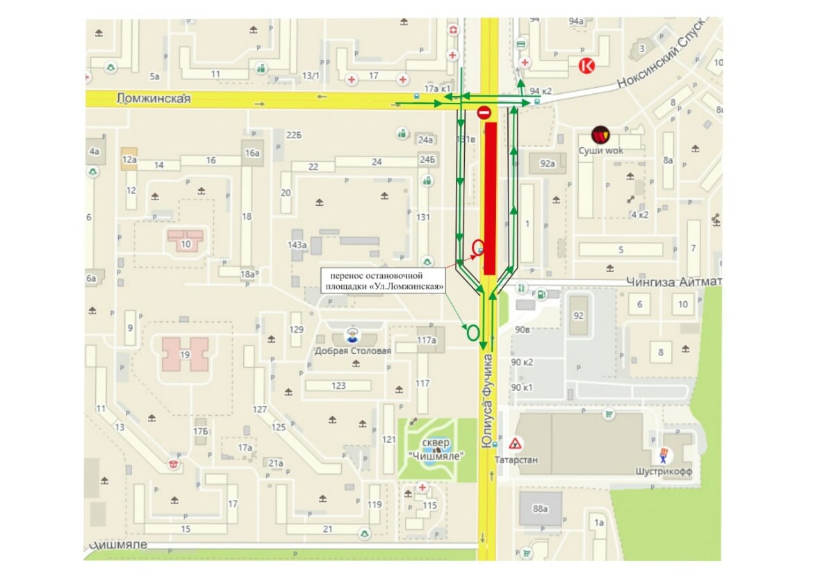 Отмечается, что остановка «Ул. Ломжинская» в направлении движения от Ломжинской в сторону улицы Чишмяле будет перенесена на 100 метров в сторону Чишмяле.