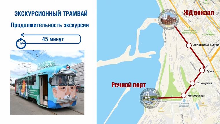 По маршруту № 2 начинает курсировать раритетный экскурсионный вагон «Тюбетейка» 1986 года выпуска, который ранее пользовался спросом у гостей и жителей Казани. При содействии Комитета по туризму была разработана новая концепция работы экскурсионного трамвая, проведен пробный рейс для туроператоров. Участники трамвайной экскурсии получат аудиогиды, а также подарочный набор, состоящий из треугольника, элеша и напитка.