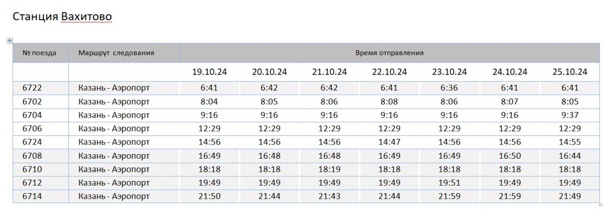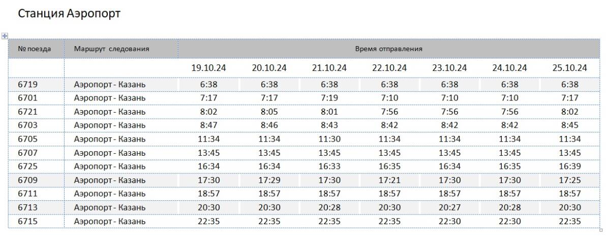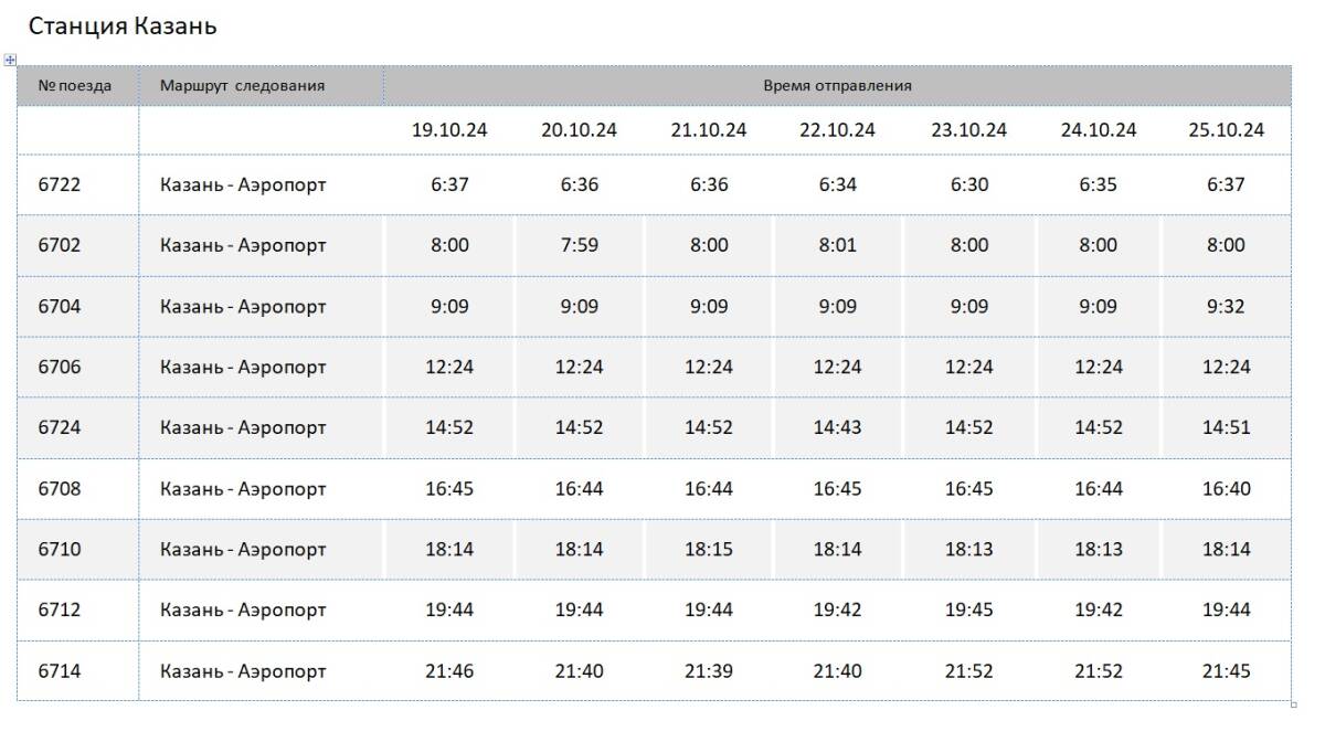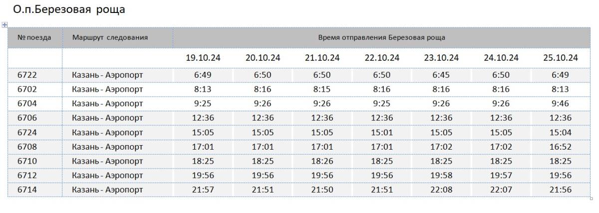 С железнодорожного вокзала Казань-1, станций Вахитово и Березовая роща электрички в аэропорт с 19 по 25 октября будут отправляться по измененному графику, сообщили в компании «Содружество».
