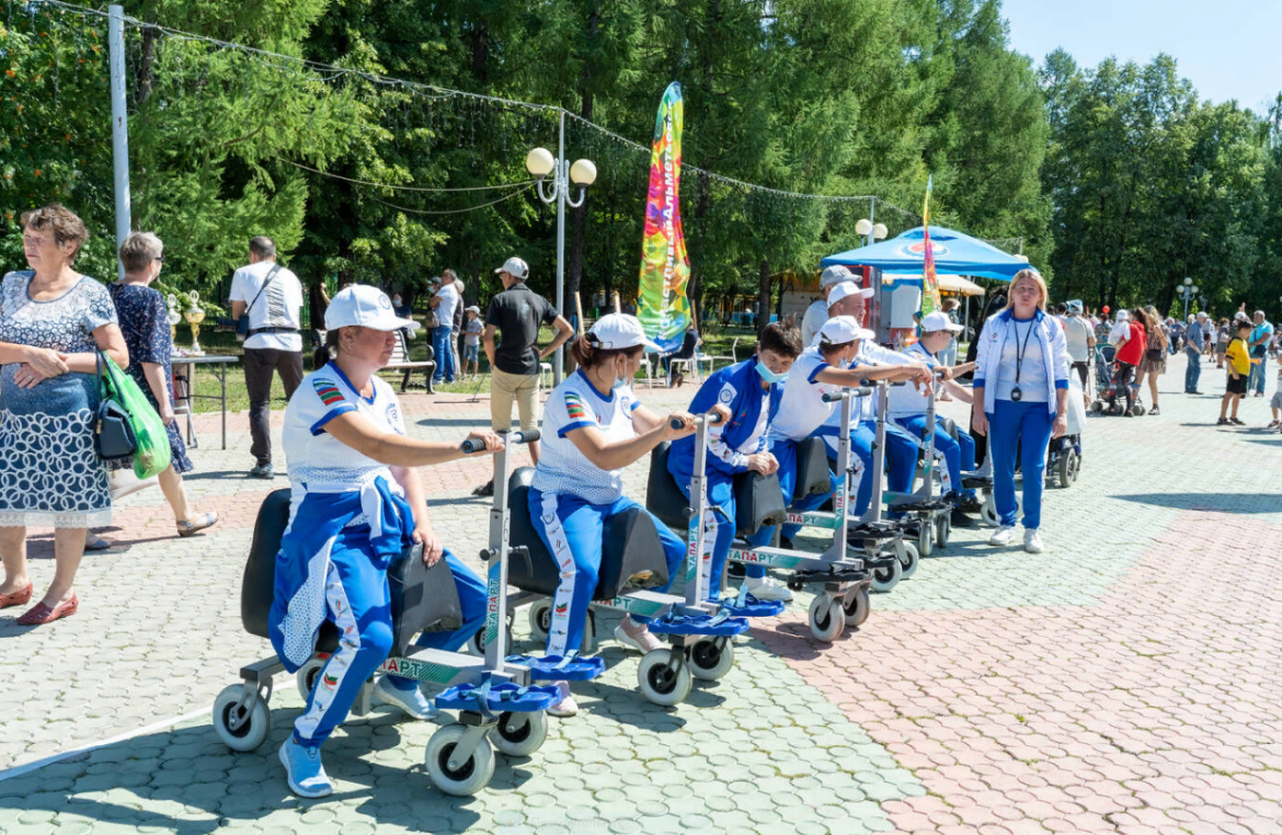 Маршрут гонки на инвалидных колясках пролегал вокруг фонтана, участникам нужно проехать змейкой, развернуться и прибыть к финишу быстрее других. У гостя из Заинска Радика Валиахметова перед другими было небольшое преимущество — необычная коляска. Она легко превращалась в своеобразный мотоцикл или велосипед, только ни заводить мотор, ни крутить педали не нужно. Радик пользуется коляской уже 24 года — падение с крыши, неудачная операция и паралич. Но унывать мужчине не дают ни друзья, ни родные. Его пригласили участвовать в таких гонках.