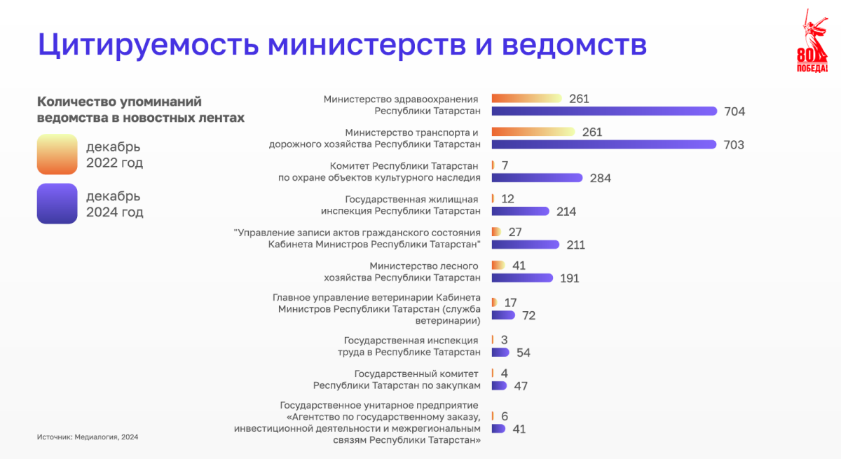 «Среди наиболее активных ведомств можно отметить министерства молодежи, здравоохранения, экологии, а также труда, занятости и соцзащиты. У некоторых показатели цитируемости в СМИ за два года выросли в три раза! Даже прежде самые закрытые министерства теперь постоянно общаются со СМИ», — сказал руководитель агентства.