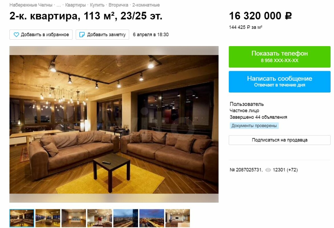 В Набережных Челнах выставлена на продажу двухкомнатная квартира за 16,3 млн рублей. Стоимость за квадратный метр составляет 144,4 тыс. рублей. Информация о продаже появилась на сайте бесплатных объявлений.