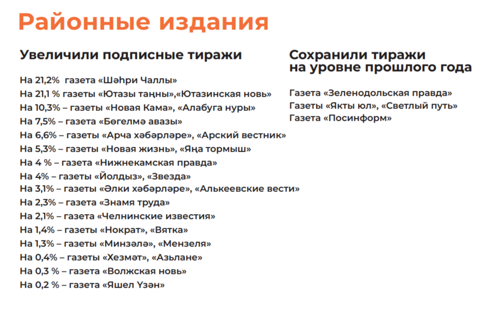 Помимо этого, показатели на уровне прошлого года смогли сохранить три крупные газеты АО «Татмедиа» — это «Зеленодольская правда», «Якты юл» / «Светлый путь» (Тукаевский район) и «Посинформ» (Нижнекамский район).