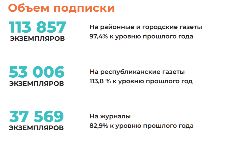 «Мы ожидали до 20% падения подписок. Но за счёт того, что мы эффективно отработали вместе с почтой и редакциями, не было допущено серьезного падения подписки в этом году. И, самое главное, у нас 16 изданий нарастили свои тиражи. Это действительно большое достижение. Это в первую очередь редакции. И самое главное, конечно, почтальоны, которые смогли дойти до каждого читателя, смогли убедить», — отметил Садыков.