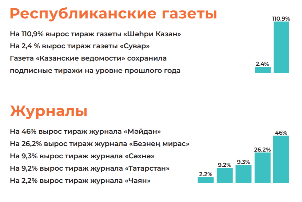 Самый высокий рост отмечен у газеты «Шәһри Казан» — ее тираж вырос на 110%. 46% прибавил журнал «Майдан», более чем на 20% выросли тиражи газет «Шәһри Чаллы», «Ютазинская новь», журнала «Безнең мирас».