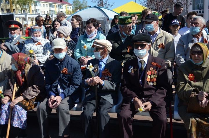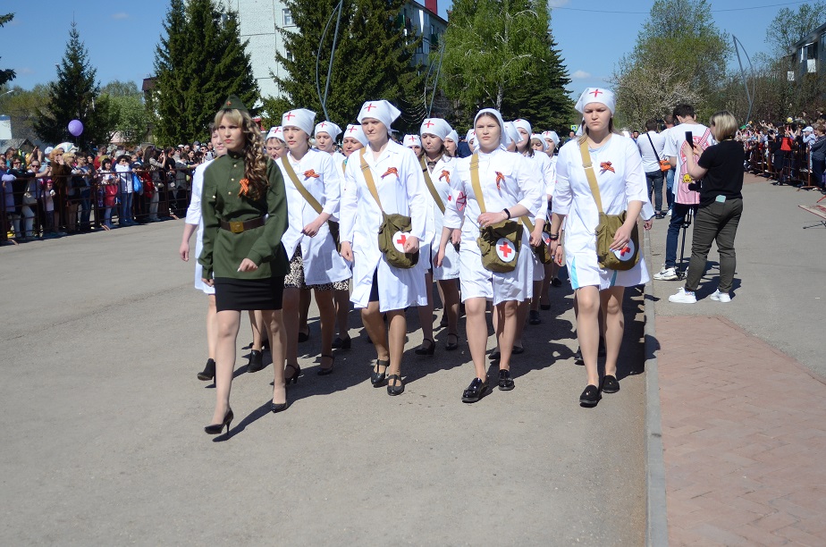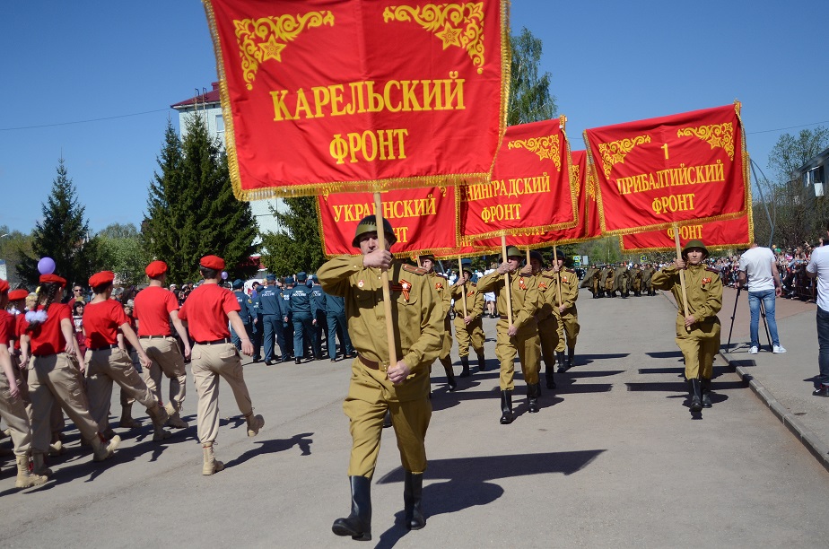 Участники Великой Отечественной войны, а их всего на весь район осталось девять, в этом году не смогли присутствовать в параде Победы, поэтому знамена всех фронтов Великой Отечественной войны пронесли по площади их внуки, переодетые в форму солдат той поры.