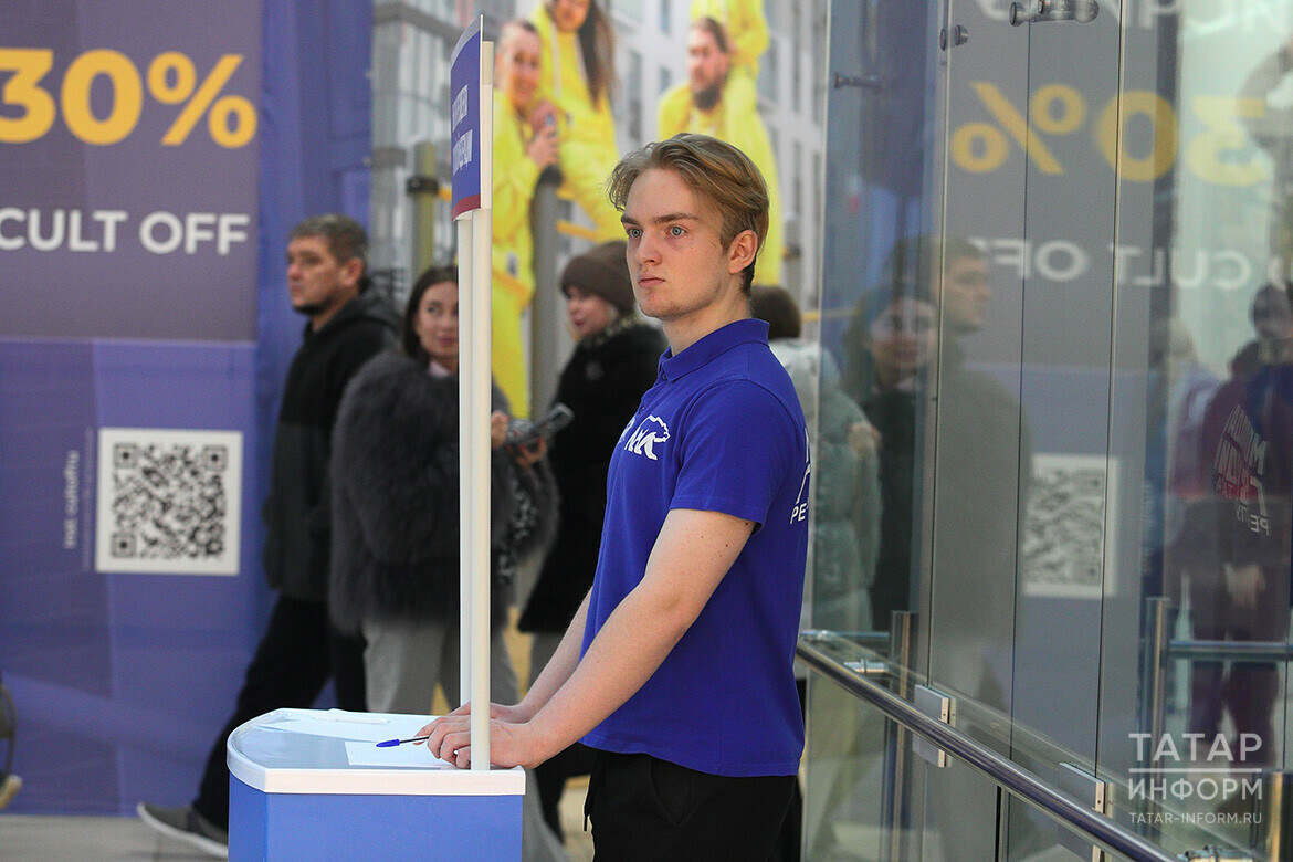 Волонтеры регионального избирательного штаба Путина установили стойку на первом этаже — в самом проходном месте торгового центра. Внимание посетителей сразу же привлекал небольшой синий столик с бело-сине-красной надписью «Россия — Путин — 2024». Несмотря на будний день, многие казанцы останавливались, чтобы выразить поддержку и оставить подпись.