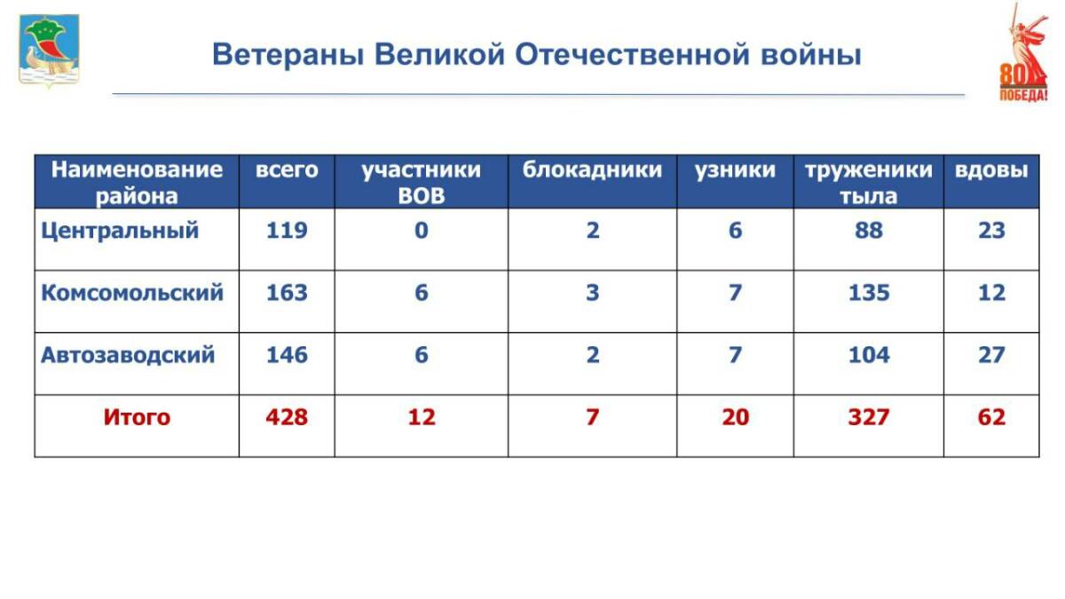 «С каждым годом все меньше остается живых свидетелей Великой Отечественной войны, а тех, кто непосредственно принимал участие в сражениях, почти не осталось. За год количество ветеранов уменьшилось на 187 человек – с 615 до 428. Самым «молодым» участникам воны (4 человека) в 2025 году исполняется 98 лет. Самым «возрастным» инвалидам ВОВ (2 человека) в феврале и марте 2025 года исполнилось по 100 лет. Среди участников и инвалидов войны – 2 женщины», – рассказал докладчик.