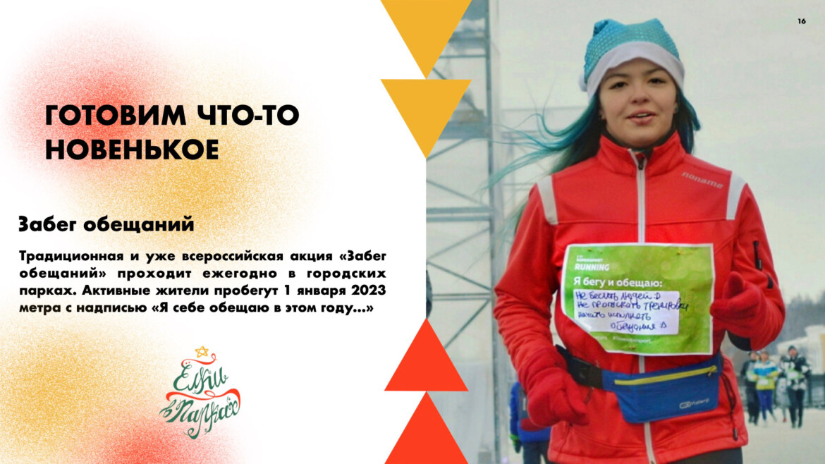 1 января в парке «Прибрежный» состоится «Забег обещаний». Участники с наклеенным на грудь логотипом «Я обещаю себе в этом году...» должны преодолеть дистанцию в 2023 метра, чтобы желаемое исполнилось.