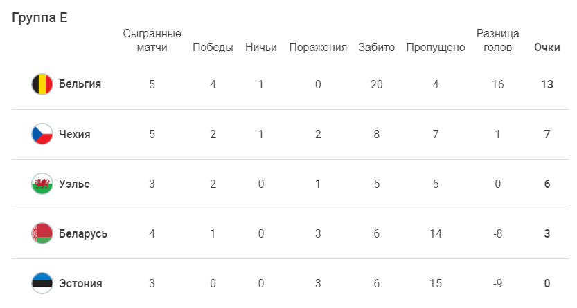 Бельгийцы уверенно лидируют в группе Е, набрав 13 очков после пяти матчей. У Белоруссии только одна победа в четырех играх.