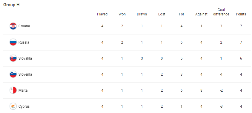 После четырех матчей у сборных Хорватии и России стало по 7 набранных очков, они по-прежнему лидируют в группе. 6 очков у Словакии, по 4 – у Словении, Кипра и Мальты.