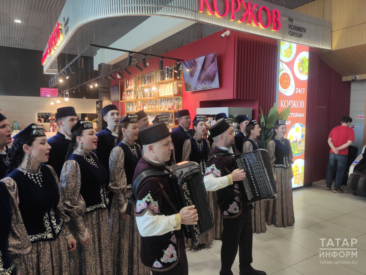 Уже в аэропорту делегацию встретили с татарскими национальными песнями, танцами и угощениями, а также спортсменам удалось потанцевать с символом грядущих игр леопардом Бриксиком.
