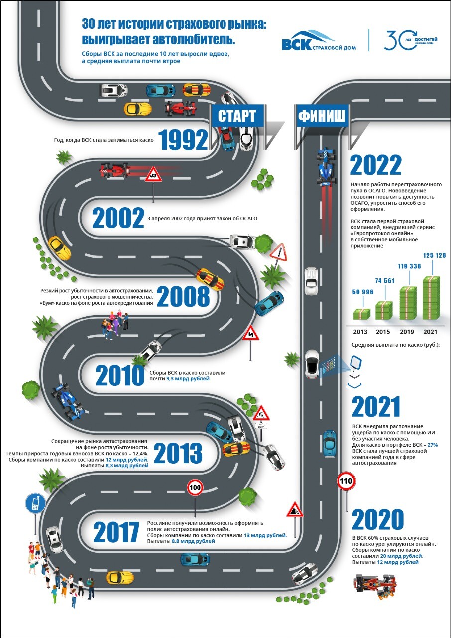 «Сейчас каско занимает первое место в портфеле ВСК по объему сборов (27%). Автострахование всегда было лидирующим направлением страхового рынка в non-life сегменте. При этом рынок за 30 лет прошел существенную трансформацию – от консолидации и ухода небольших игроков, до применения digital-технологий и динамичного роста сборов. Залогом успеха ВСК является диверсифицированный по каналам продаж и клиентам портфель. Страховой Дом ВСК работает на рынке уже 30 лет, и для нас важно не только демонстрировать стабильно высокие финансовые результаты, но и формировать доверие наших клиентов. Выплаты по каско в ВСК за все годы росли пропорционально сборам, а средняя выплата увеличилась почти в 3 раза – т. е. росла быстрее инфляции», — отметил Антон Смулько, заместитель генерального директора по андеррайтингу Страхового Дома ВСК.