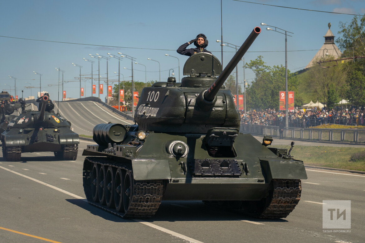 Знаменная группа прошла с государственными флагами России и Татарстана, а также со штандартами фронтов Великой Отечественной войны и Знаменем Победы. После этого проехала колонна военной техники, среди которой были танки ИС-3, Т-34 и ПТ-76, советская противотанковая самоходная артиллерийская установка СУ-100 и «Катюша». Всего в параде участвовали 24 единицы техники времен Великой Отечественной войны.