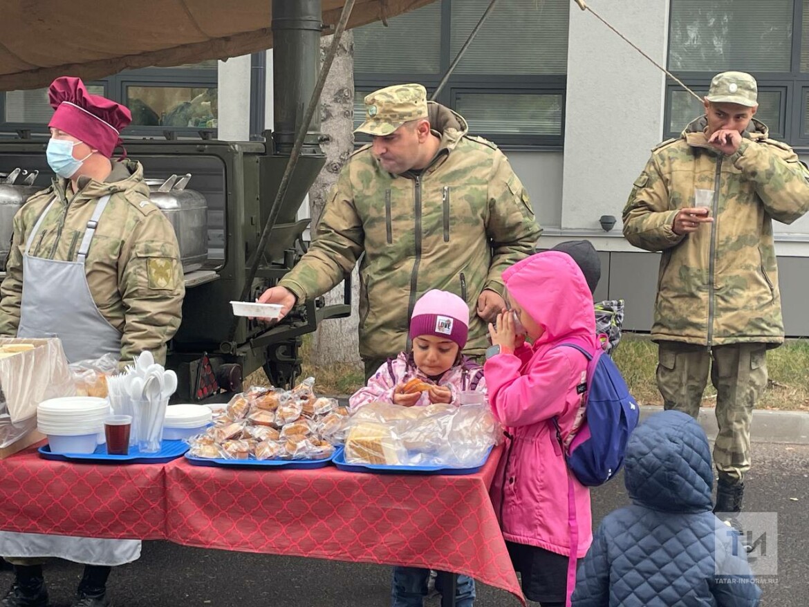 Перед началом праздника на улице поставили полевую кухню. Всех желающих угощали кашей, чаем и сладостями.