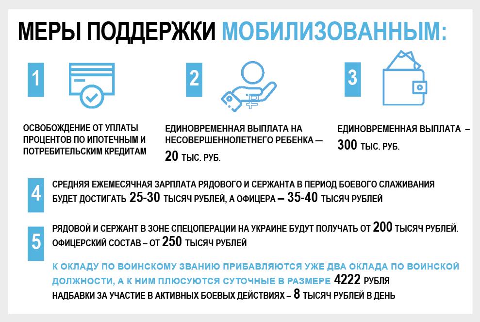 В документе, к примеру, прописана единовременная выплата мобилизованному в размере 300 тыс. рублей. Кроме того, там говорится об освобождении от уплаты процентов по ипотечным и потребительским кредитам. Кредитные каникулы предоставляются на период прохождения службы. Также мобилизованные, исходя из текста законопроекта, будут освобождены от уплаты налога на имущество. Стоит отметить, что общих «правил» нет и каждый регион будет самостоятельно принимать решение о том, какие именно меры поддержки необходимы семьям резервистов.