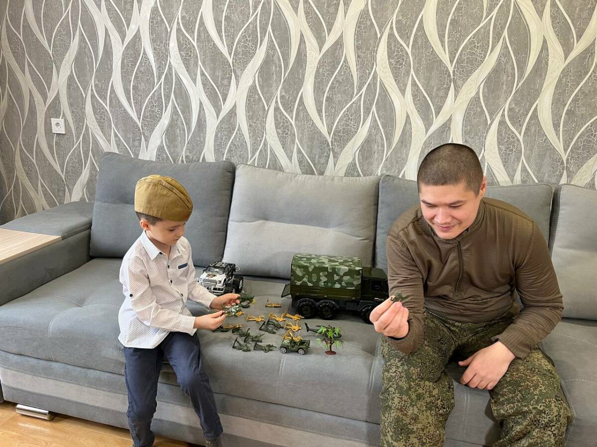 «Вот нас встречает настоящий солдат. И мы привели в гости настоящего солдата», – с этими словами боец вручил ребенку подарки – военные игрушки: солдатиков и небольшой КАМАЗ.