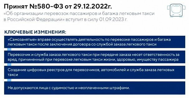 В конце прошлого года был принят новый федеральный закон, касающийся организации перевозок пассажиров и багажа легковым такси в России. Основные изменения, внесенные в прежнее законодательство, касаются допуска на рынок самозанятых, ответственности перевозчика за нанесенный вред, создания цифровых реестров.