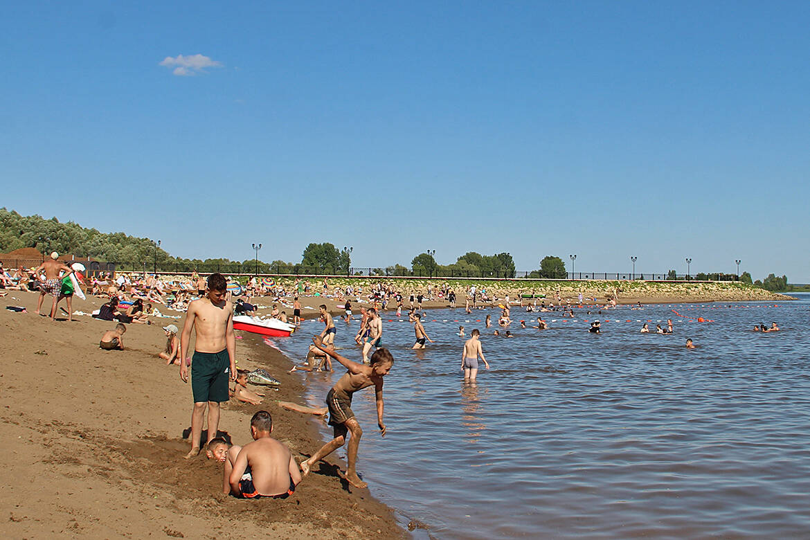 Новая набережная получила песчаный выход к воде и полноценную инфраструктуру для отдыха. На территории оборудованы крытый павильон, фотозона, душевые кабины, детские игровые площадки, причал для катеров, работает ресторан с панорамным видом на реку. Для любителей активного отдыха открыт пункт проката – здесь можно взять SUP-доски, велосипеды и другое спортивное оборудование.