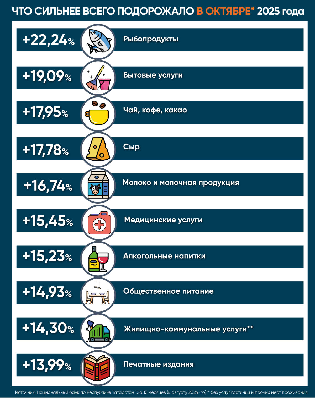 Динамика цен в Татарстане во многом, естественно, повторяет общероссийскую. По данным Росстата, в октябре потребительские цены по РФ выросли на 0,5% (после сентябрьских 0,34%). При этом сильнее всего подорожали продукты – на 1,05% (месяцем ранее было 0,03%), в «непродах» ускорение вышло символическим – на 0,67% (после 0,59% в сентябре).
