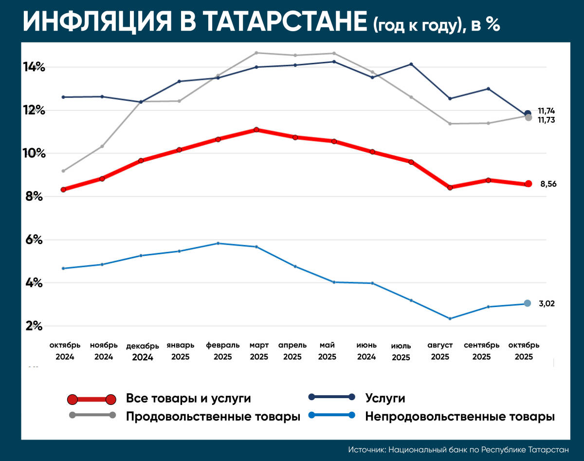 Годовая инфляция в Татарстане, как и в России в целом, в октябре замедлилась – с сентябрьских 8,76% до 8,56%. Это по-прежнему выше, чем в целом по стране (7,71%), но ниже, чем по Приволжскому федеральному округу (8,66%). Подробности – в ежемесячном обзоре аналитического центра «Татар-информа».