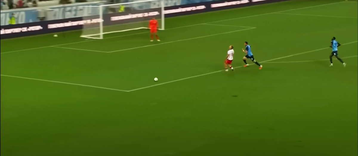 Расстояние до мяча было небольшим, а пространства много. Но Глушенков решил не тратить силы на это. Фото: скриншот с трансляции