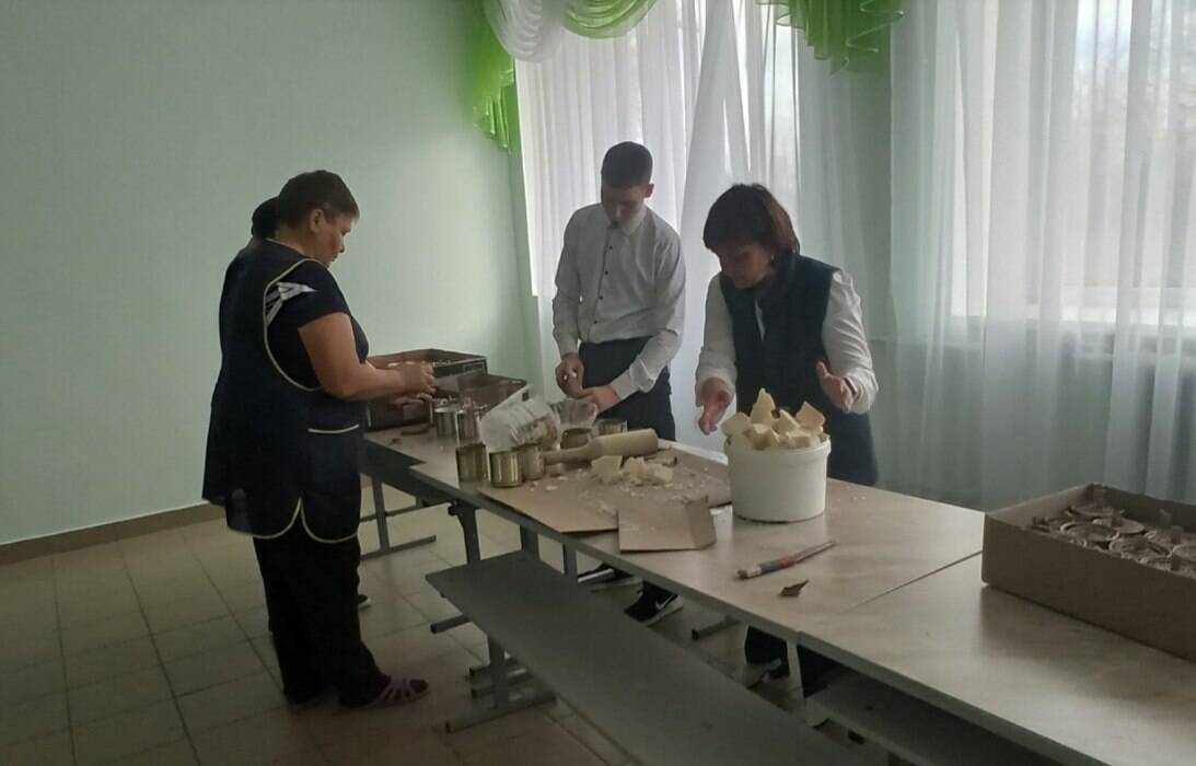 Ученики под наблюдением взрослых разделили 5 килограммов парафина на несколько кусков и расплавили их на плите в школьной столовой. Затем осторожно разливали по готовым банкам.