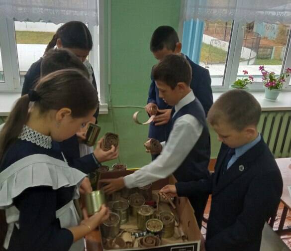 Для изготовления окопных свечей ученики вымыли и высушили освободившиеся банки из-под кукурузы, зеленого горошка, рыбных консервов, а края жестяных банок согнули и выровняли так, чтобы не поранить руки. Важно, чтобы в банке не было отверстий, иначе из нее вытечет расплавленный парафин.