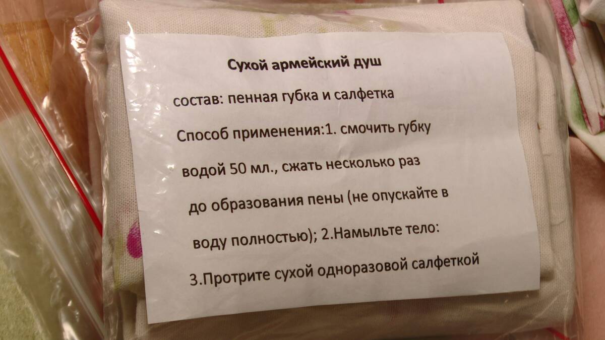 «Солдат туда наливает немного водички, оно пенится хорошо, и вытирает руки, лицо, потом все тряпочкой. Оно не требует смывания. Наша с вами задача – три ингредиента сложить в один пакетик».