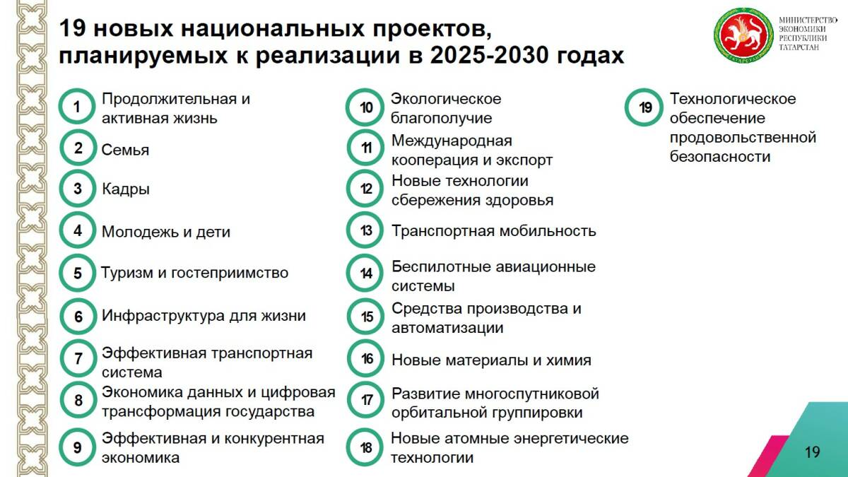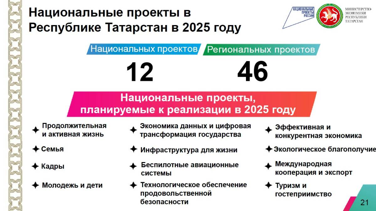 На смену 13 национальным проектам, которые реализовывались в Татарстане с 2019 года, республика приступила к исполнению 12 новых. Это «Семья», «Молодежь и дети», «Продолжительная и активная жизнь», «Инфраструктура для жизни», «Экологическое благополучие», «Кадры», «Эффективная и конкурентная экономика», «Технологическое обеспечение продовольственной безопасности», «Туризм и гостеприимство», «Международная кооперация и экспорт», «Экономика данных и цифровая трансформация государства» и «Беспилотные авиационные системы».