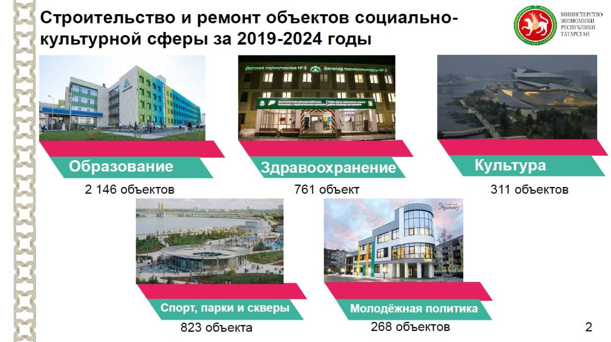 Построены и отремонтированы 70 объектов культуры, включая театры, музеи и библиотеки. Благодаря национальному проекту в Казани появился Центр детской онкологии, а по всей республике возведено и модернизировано около 400 объектов здравоохранения.