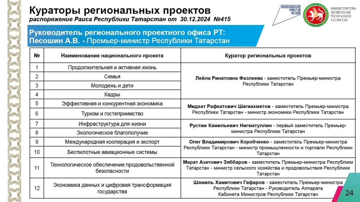 Кураторами национальных проектов и соответствующих региональных программ назначили вице-премьеров Татарстана. Так, например, Лейле Фазлеевой доверили треть нацпроектов в республике («Семья», «Молодежь и дети», «Продолжительная и активная жизнь», «Кадры»), Мидхату Шагиахметову, Рустаму Нигматуллину, Олегу Коробченко (глава Минпромторга РТ) досталось по два нацпроекта. Глава Минсельхозпрода РТ Марат Зяббаров будет отвечать за «Технологическое обеспечение продовольственной безопасности», а руководитель Аппарата Кабинета Министров Республики Татарстан Шамиль Гафаров – за «Экономику данных и цифровую трансформацию государства».