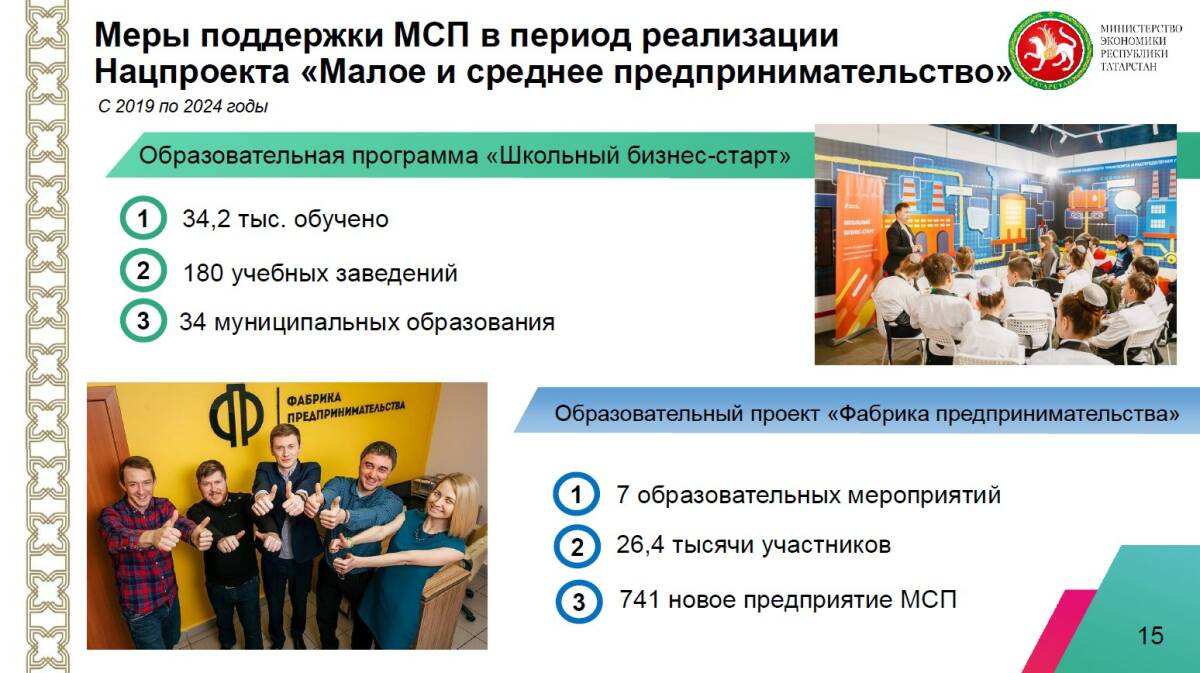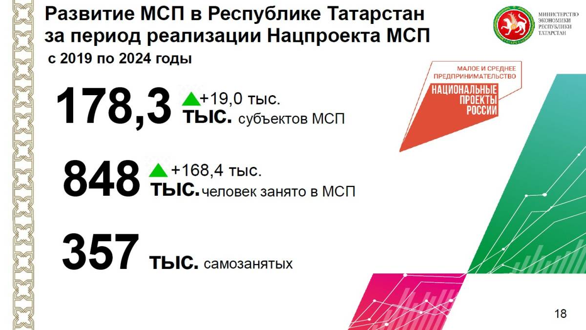 Большое внимание министр экономики РТ уделил национальному проекту «Малое и среднее предпринимательство», который завершился в 2024 году. Теперь меры поддержки малому и среднему бизнесу будут оказывать по нацпроекту «Эффективная и конкурентная экономика».