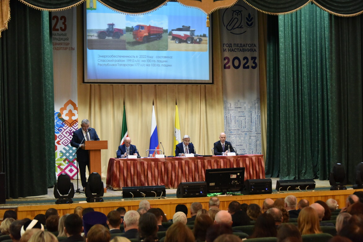 С приветственным словом к собравшимся обратился глава Спасского района Фаргад Мухаметов. В докладе он отметил, что 2022 год для аграриев выдался сложным, но, несмотря на погодные аномалии, им удалось собрать рекордный урожай. В минувшем году в районе было собрано более 177 тыс. тонн зерна. Также проведена существенная работа по вовлечению в оборот неиспользуемых земель, благодаря чему еще 663 гектара теперь находятся в обработке.