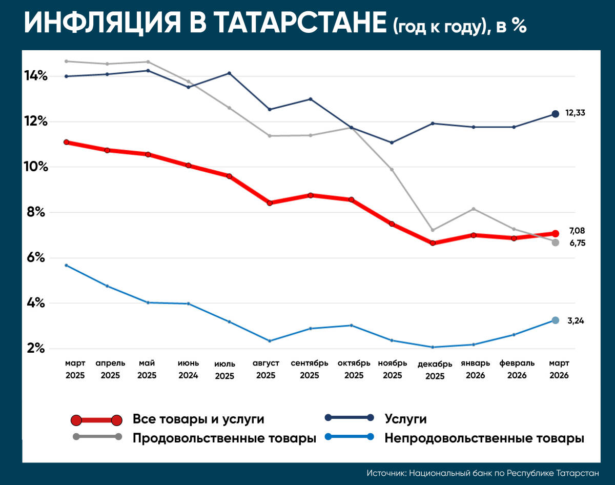 Годовая инфляция в Татарстане в марте оказалась выше январского уровня – с 6,86% в феврале подскочила до 7,08%. Это не опять, а снова выше, чем и в целом по стране (5,86%), где замедление продолжается, и по Приволжскому федеральному округу (6,67%). О мартовских трендах – в ежемесячном обзоре аналитического центра «Татар-информа».