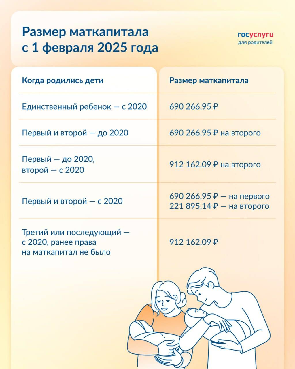 «Это самая высокая мера поддержки, за [определенное] время материнский капитал увеличился в три раза. С 1 февраля 2024 года размер материнского капитала был проиндексирован на 7,4%, составив 630 тыс. рублей на первого ребенка и 833 тыс. рублей — на второго. Также с 2024 года владельцами материнского капитала могут стать только родители, имеющие российское гражданство на момент рождения или усыновления ребенка», — напомнил он.