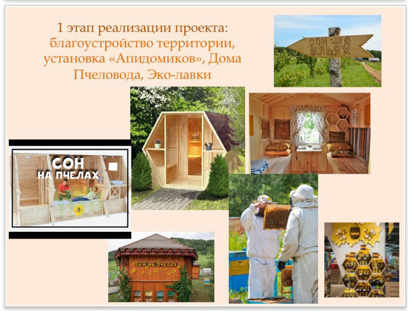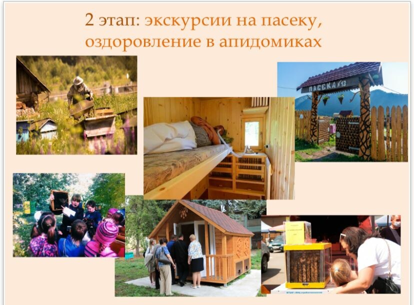 Здесь появится несколько пасек, а для туристов в апидомиках будет организован сон на пчелах. Нахождение рядом с ульями на пасеках оздоравливает человека. Желание использовать эту природную силу во благо человека породило новое направление в официальной медицине — аэроапитерапия. Так возник оздоровительный метод, получивший название «сон на ульях».
