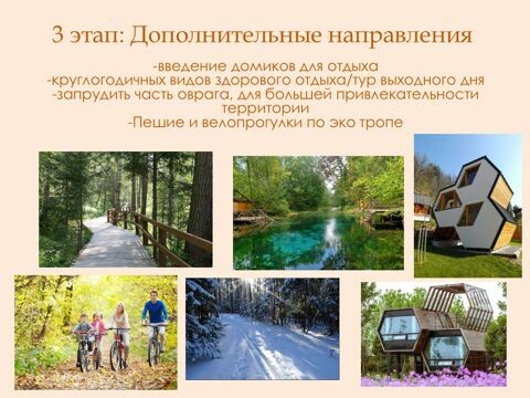 Третий этап предполагает создание домиков для отдыха и введение круглогодичных видов здорового отдыха, туров выходного дня. Также планируется запрудить часть оврага для большей привлекательности территории, организовать пешие и велопрогулки по экотропе. Здесь появится несколько пасек, а для туристов в апидомиках будет организован сон на пчелах.