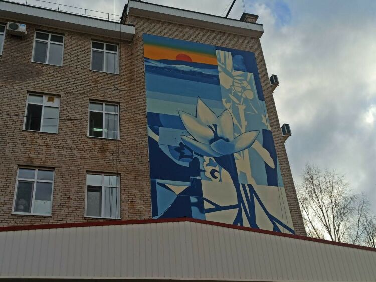 Тем временем на фасаде Альметьевской ЦРБ появилась картина в виде большого цветка крокуса. Автор мурала – уличный художник из Москвы, работающий под псевдонимом Найнти. Созданная им картина выдержана в белых, голубых и красных тонах. Граффити включает изображения корней, символизирующих преемственность, и рассвет – знак надежды на исцеление.
