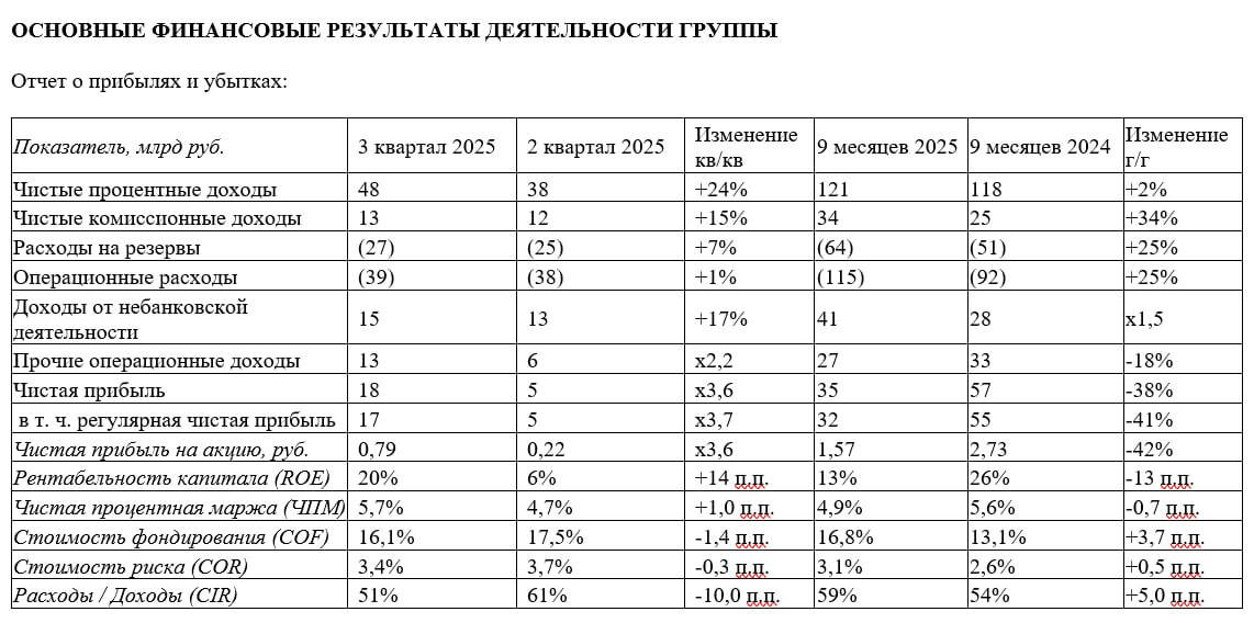 - Чистые процентные доходы: 121 млрд руб. (+24% 3кв./2кв. и +2% г/г)