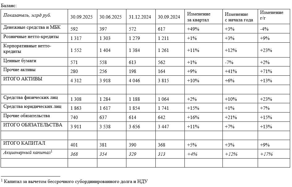 - Акционерный капитал: 368 млрд руб. (+4% 3кв./2кв. и +17% г/г)