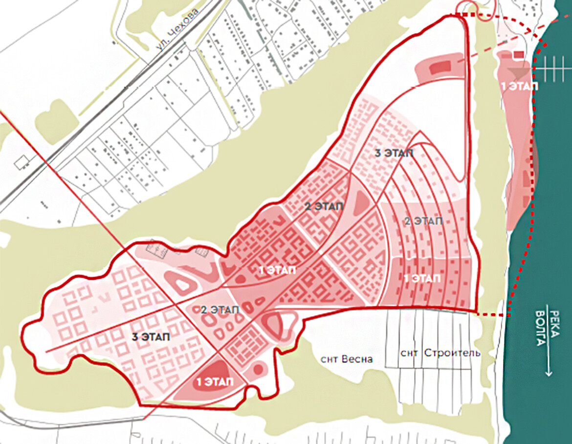 Проект разбит на три этапа. На первом – в 2023-2025 годах – планируется создать 5 тыс. рабочих мест на 7,2 тыс. жителей. Для них планируется построить первое жилье, школу и детские сады, основные дороги. Также здесь появятся первые строения медкластера и технопарка, также часть набережной.